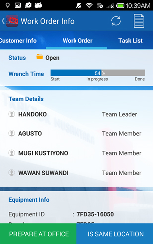 After the work order is produced, it will be dispatched to mechanics. Mechanics will then perform various tasks on the device, such as status updates, report inputs, request and returning parts, taking pictures, pinpoint unit location, calling customers directly, map navigation, up until the work order is done.