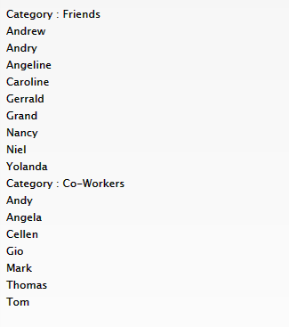 <Intersoft:UXItemsControl ItemsSource="{Binding Items}" DisplayMemberPath="Name"> <Intersoft:UXItemsControl.GroupStyle> <Intersoft:GroupStyle HeaderStringFormat="{}Category : {0} "/> </Intersoft:UXItemsControl.GroupStyle> </Intersoft:UXItemsControl> |