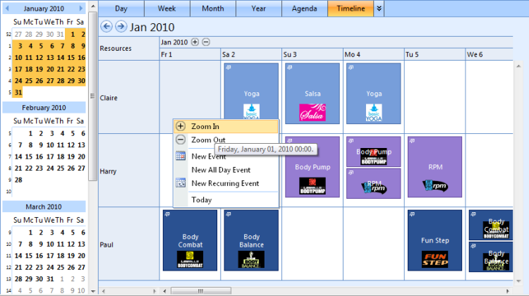 Context-menu provides hassle-free access to the most basic features in WebScheduler. WebScheduler is enhanced further to support Timeline’s zooming feature. In addition to the default zooming buttons on the date header, user can now access the zooming functions through context-menu.