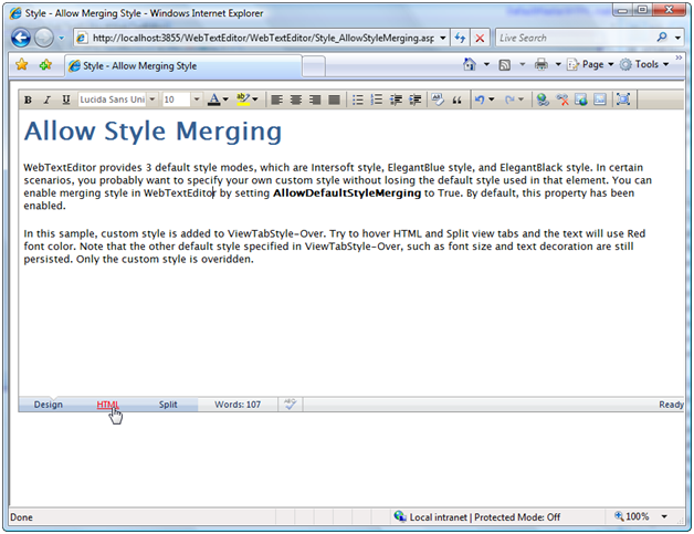 - In this sample, custom style is added to ViewTabStyle-Over. Try to hover HTML and Split view tabs and the text will use Red font color.