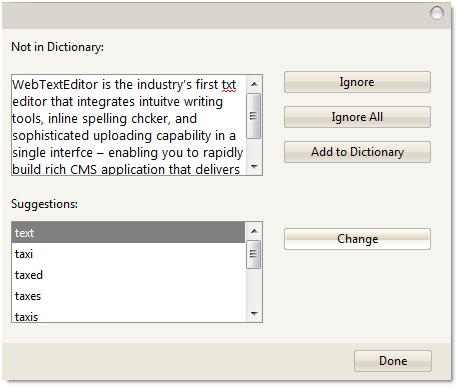 This option is only available in WebDialogBox mode; it is used to change the selected misspelled word with the selected suggested word.