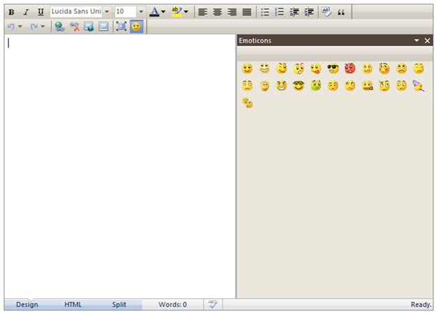 - Implement WebTextEditor InitializeToolBar server side event to add Emoticon command to show/hide the Emoticon task pane. Here is the snippet: