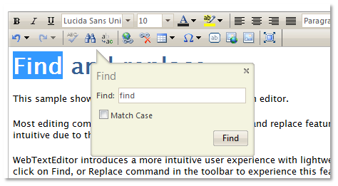 WebTextEditor's unique search feature allows user to search in both design and html view. As in other commands, the Find command displays lightweight callout interface to provide a better searching experience. When a match is found, the text will be selected. Additional message about the search result will be displayed inside the callout interface.