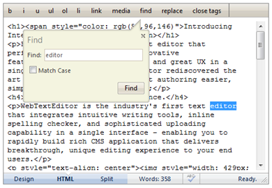 There is no formatting applied to the content in HTML view, thus making it difficult to find a certain text. WebTextEditor provides Find and Replace functionality in HTML toolbar for easy text searching.