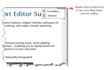 Context menu items in header area represent each toolbar available in WebTextEditor. The toolbar can be easily hidden by un-toggling the related menu item. When all toolbars are hidden, the header area will be compressed to 5px height, thus providing a larger editing area for user. The toolbar can easily be displayed afterwards, by toggling the related menu item.