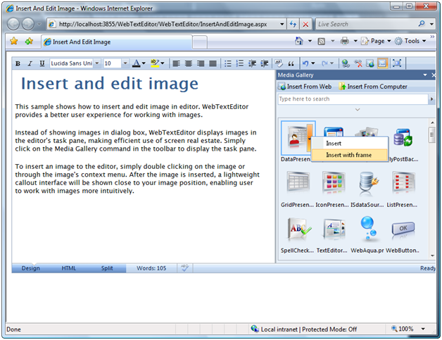 - To insert an image to WebTextEditor, simply double clicking on the image or through the image's context menu. You can insert image along with its frame using image's context menu.