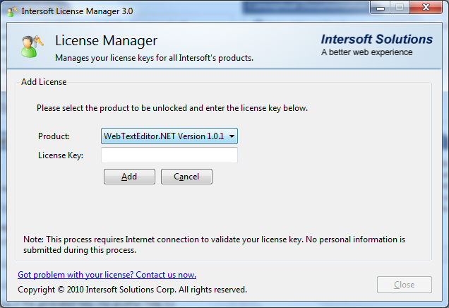 - To install the full version of WebTextEditor, proceed by using License Manager that can be triggered from Start menu >> All Programs >> Intersoft WebUI Studio 2010 R1 >> License Manager.
