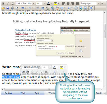 To provide a more intuitive editing experience, floating toolbar -- similar to Mini toolbar provided in Microsoft Office Word 2007 -- is natively supported in WebTextEditor. This feature can be enabled by setting ToolBarSettings >> EnableFloatingToolBar property to true.