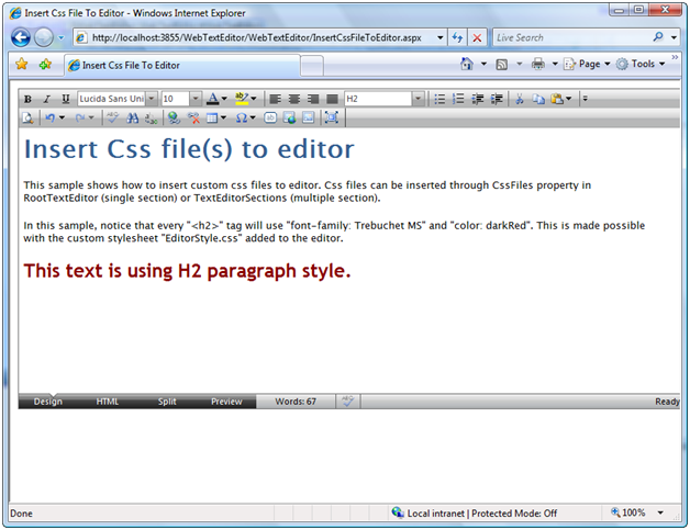 - In this sample, notice that every "<h2>" tag will use "font-family: Trebuchet MS" and "color: darkRed". This is made possible with the custom stylesheet "EditorStyle.css" added to the editor.