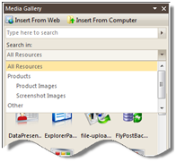 The collection of media resource will be listed as hierarchical layout in Media Resources combo. For example: in the above screenshot, Product Images resource and Screenshot Images resource are grouped in Products group. When user selects Product Images item, the search will be performed in Product Images folder. If Products group is selected, search will be performed against all resources included in Products group, Product Images and Screenshot Images.