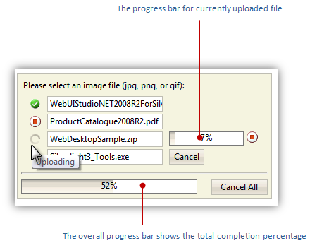 WebFileUploader shows two types of progress bar, for each file upload and for overall upload progress status.
