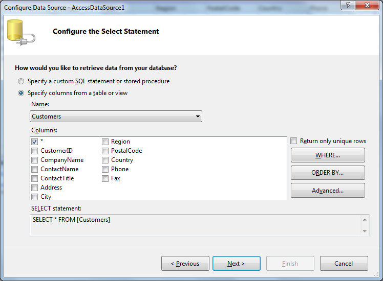 - Use Data Source Configuration Wizard to set the Database and table.