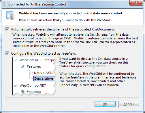 2. After you select the Xml file you want to bind, a wizard will appear. Select Configure this WebGrid to act as TreeView.