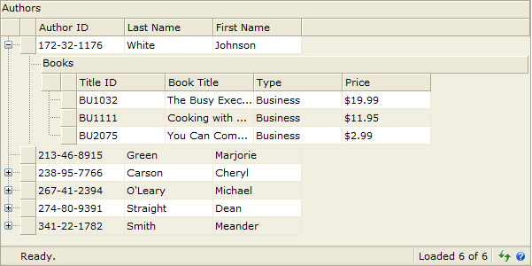 childRows[1].Cells.SetItemData(new object[] { "BU1111", "Cooking with Computers: Surreptitious Balance Sheets", "Business", 11.95 });