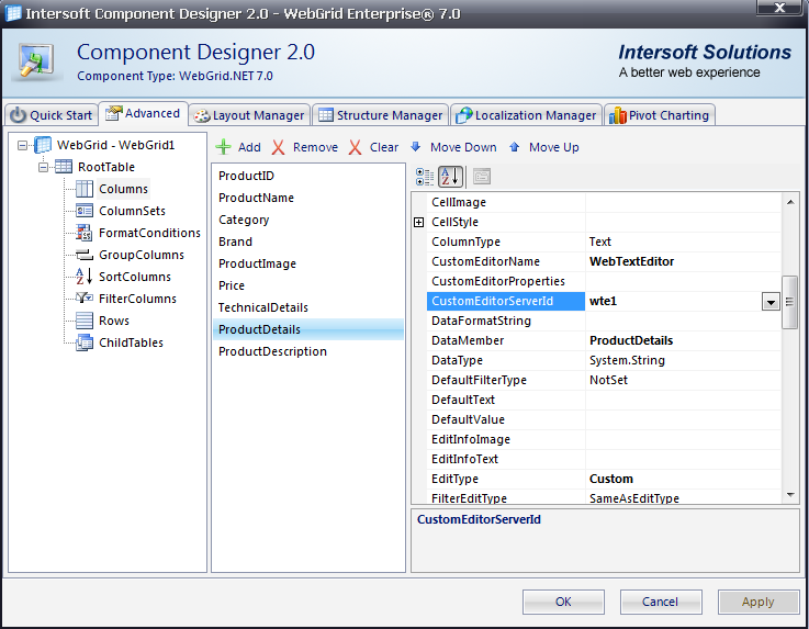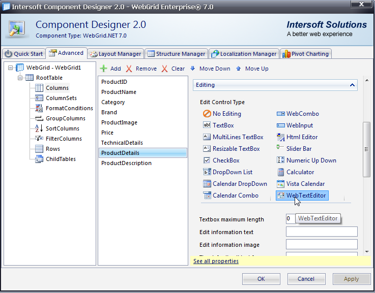 - Right click on WebTextEditor control and choose WebGrid Designer.