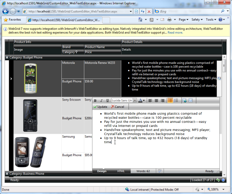 WebGrid now supports integration with Intersoft's WebTextEditor as editing type.