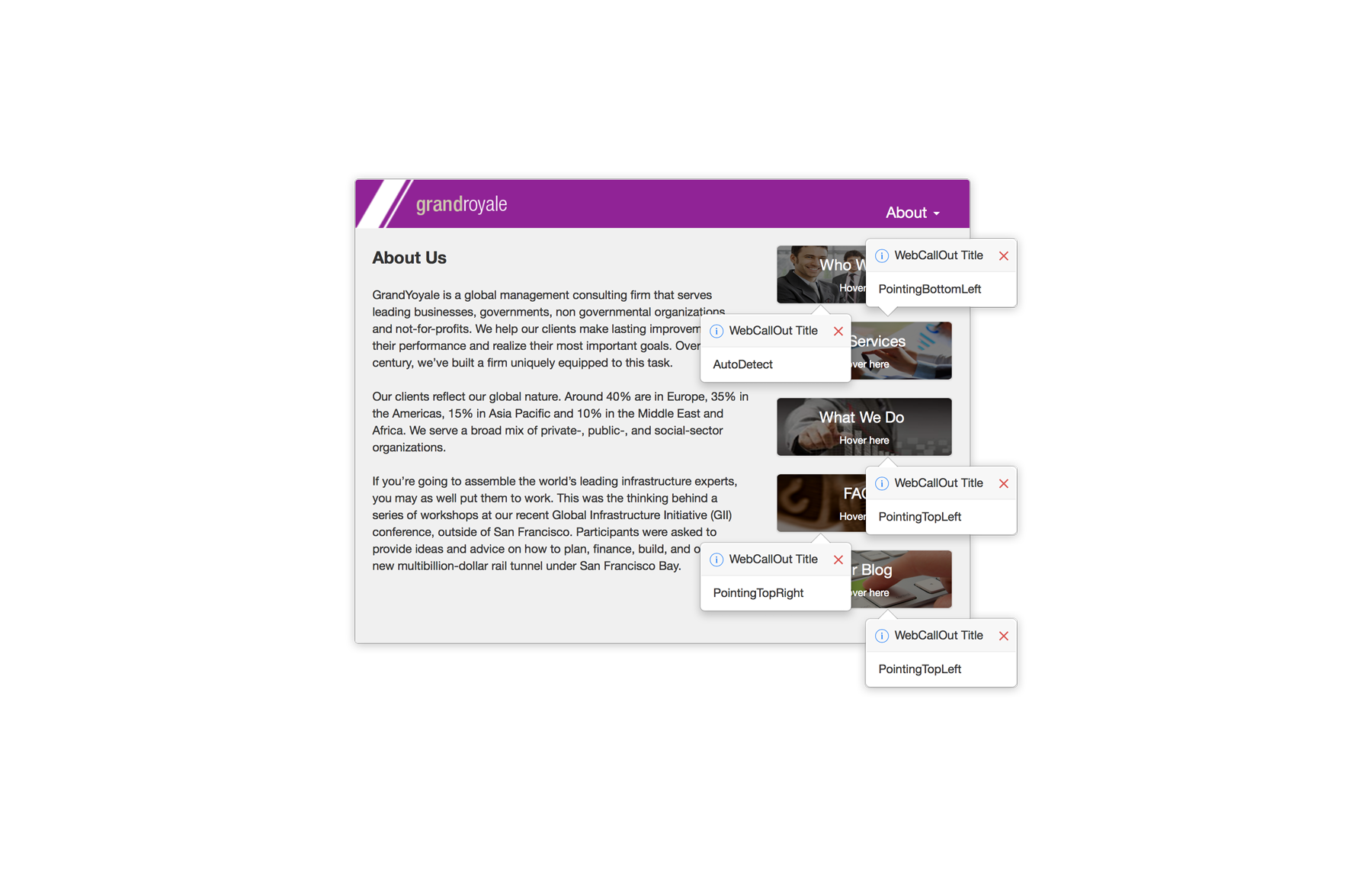 WebCallOut is a superior replacement for the standard tooltip. With its beautifully designed styles, appealing visual effects, and customizable elements, WebCallOut has everything you need to build the perfect tooltip to complement your web applications.