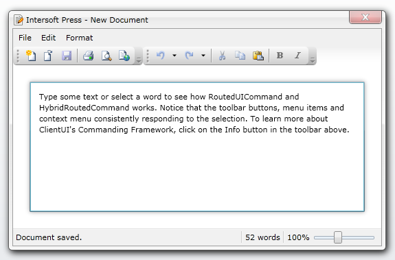 <Intersoft:UXStatusBar Intersoft:DockPanel.Dock="Bottom" Height="25"> <Intersoft:UXStatusBarItem Content="Document saved."/> <Intersoft:UXSeparator/> <Intersoft:UXStatusBarItem Content="52 words" /> </Intersoft:UXStatusBar> |