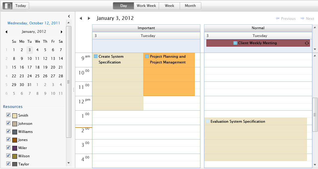 <Intersoft:UXScheduleView DisplayDate="1/2/2012" EventsSource="{Binding Events}" CategoriesSource="{Binding Categories}" ResourcesSource="{Binding Resources}" FilterGroupCommand="{Binding FilterGroupCommand}"> <Intersoft:UXScheduleView.GroupCollection> <Intersoft:UXScheduleViewGroup PropertyName="DivisionID"> <Intersoft:UXScheduleViewGroupItem Value="1" Display="Development" /> <Intersoft:UXScheduleViewGroupItem Value="2" Display="Support" /> <Intersoft:UXScheduleViewGroupItem Value="3" Display="Marketing" /> </Intersoft:UXScheduleViewGroup> <Intersoft:UXScheduleViewGroup PropertyName="Mode"> <Intersoft:UXScheduleViewGroupItem Value="1" Display="Important" /> <Intersoft:UXScheduleViewGroupItem Value="0" Display="Normal" /> </Intersoft:UXScheduleViewGroup> </Intersoft:UXScheduleView.GroupCollection> <Intersoft:UXScheduleDayView/> <Intersoft:UXScheduleDayView Header="Next 3 Days" NumberOfDays="3"/> </Intersoft:UXScheduleView> |