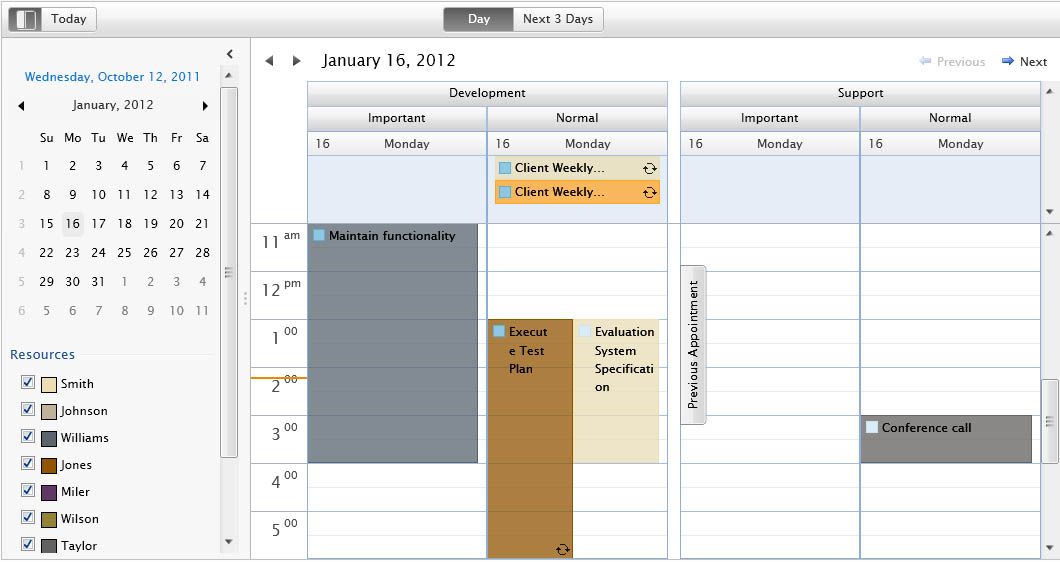 <Intersoft:UXScheduleView DisplayDate="1/2/2012" EventsSource="{Binding Events}" CategoriesSource="{Binding Categories}" ResourcesSource="{Binding Resources}" FilterGroupCommand="{Binding FilterGroupCommand}"> <Intersoft:UXScheduleView.GroupCollection> <Intersoft:UXScheduleViewGroup GroupInterval="DateTime"/> <Intersoft:UXScheduleViewGroup> <Intersoft:UXScheduleViewGroupItem Value="1" Display="Development" /> <Intersoft:UXScheduleViewGroupItem Value="2" Display="Support" /> <Intersoft:UXScheduleViewGroupItem Value="3" Display="Marketing" /> </Intersoft:UXScheduleViewGroup> </Intersoft:UXScheduleView.GroupCollection> <Intersoft:UXScheduleDayView Header="Next 2 Days" NumberOfDays="2"/> <Intersoft:UXScheduleDayView Header="Next 4 Days" NumberOfDays="4"/> <Intersoft:UXScheduleWeekView/> </Intersoft:UXScheduleView> |