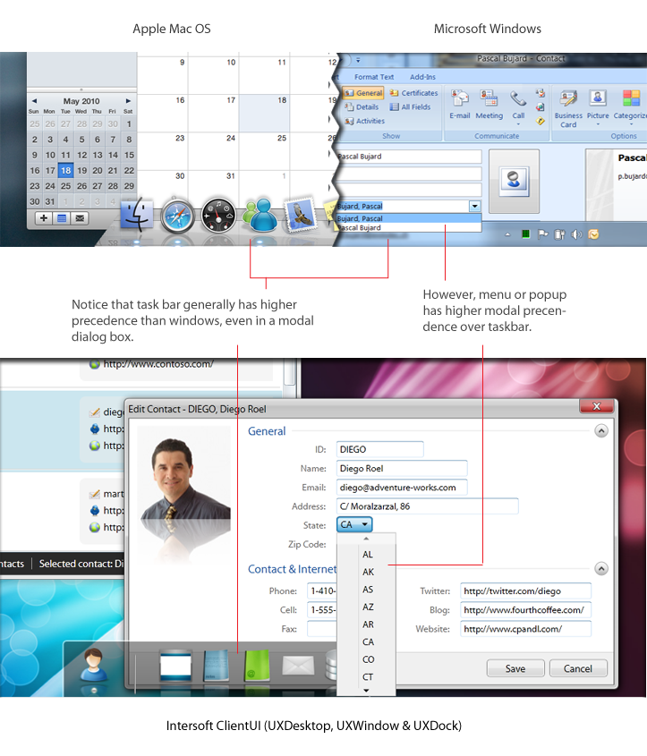 The following illustration shows how the precedence in input modality is consistently implemented in platform standards such as Windows and Mac, as well as in the ClientUI's windowing controls.
