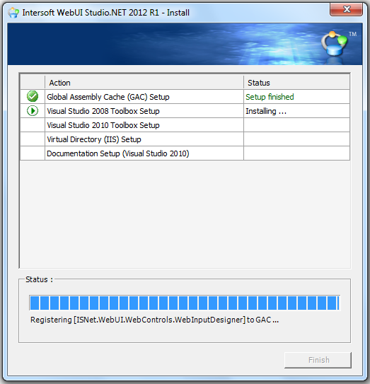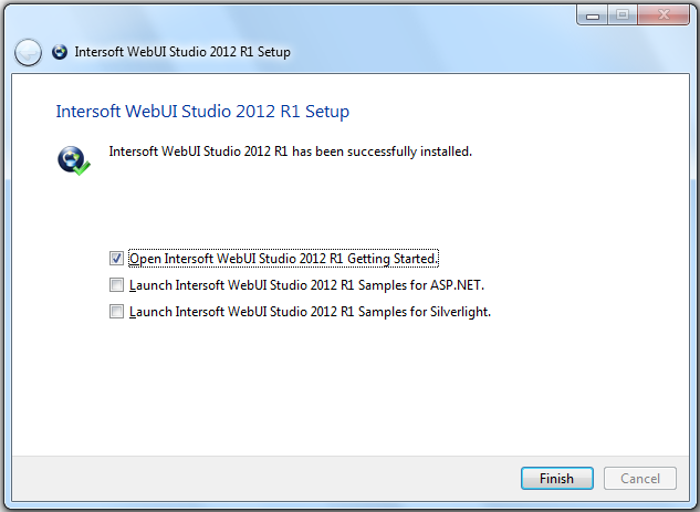 - After the installation process has been finished, you will see a confirmation window. Click Finish to close the window. At this rate, you have successfully installed the Intersoft WebUI Studio 2012 R1.