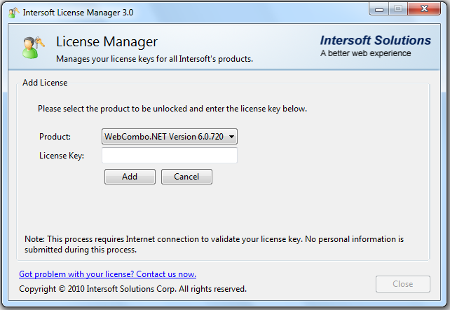 - To install the full version of WebCombo 6, proceed by using License Manager that can be triggered from Start menu >> All Programs >> Intersoft WebUI Studio 2012 R1 >> License Manager.