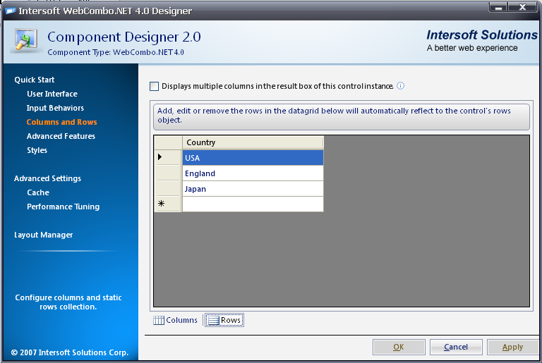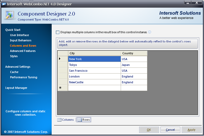 - Click on the Rows to add some rows to WebCombo2's columns.