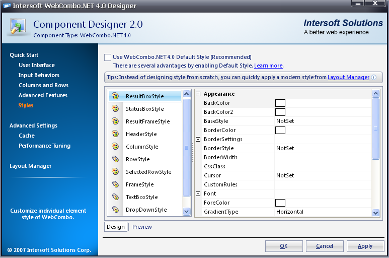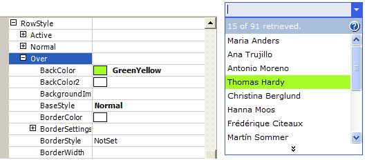 The rich WebStyle and DynamicStyle object in WebCombo which inherited from WebUI Framework enables non-technical designers or developers to easily customize the appearance of the WebCombo by changing the Style's properties visually, without has to delve into technical CSS syntax or HTML knowledge. |