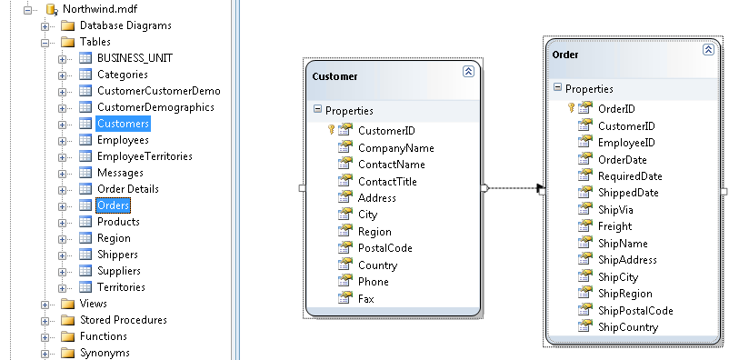 Finally, open Server Explorer, then drag the desired SQL tables into the designer surface of the newly created Northwind.dbml such as shown below: