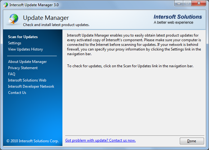 Intersoft WebUI Studio® includes an update manager application which allows you to easily download and install new updates. Product hotfixes are released on monthly basis to provide the most time-efficient enhancements and values to existing customers. To check, download and install for updates, simply launch Update Manager from Intersoft WebUI Studio program group.