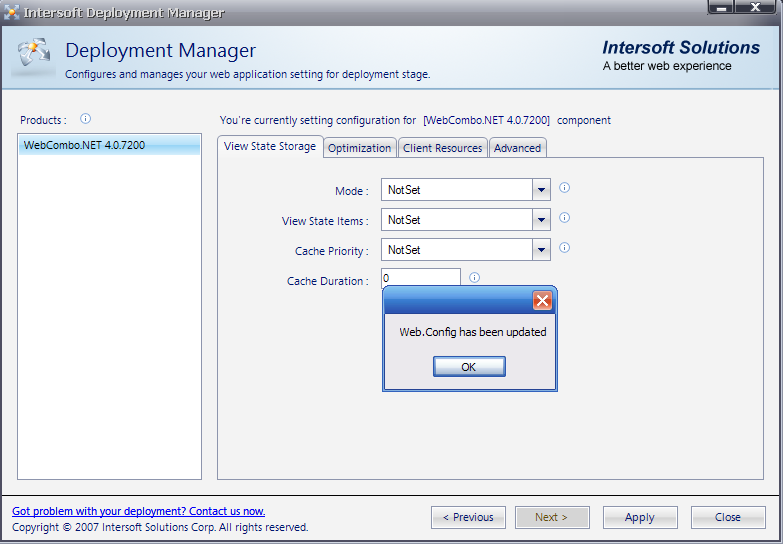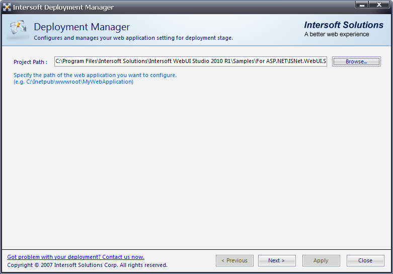 - Open Deployment Manager from Start menu >> All Programs >> Intersoft WebUI Studio 2010 R1 >> WebUI Studio for ASP.NET >> Deployment Manager.