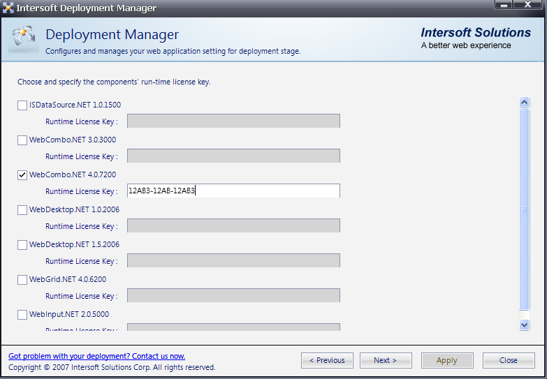 - Tick WebCombo.NET 4.0.7200 and put the Runtime License key according to the component. Click Next to proceed to the next step.