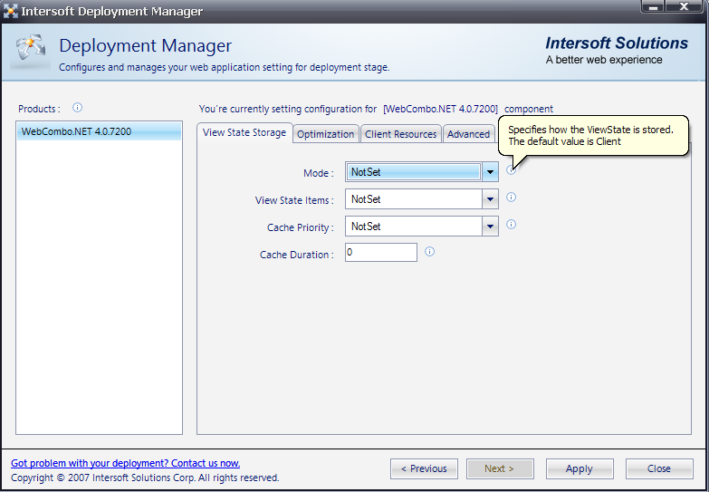 View State Storage section lets you configure how ViewState is stored, specify how ViewState items are going to be saved in ViewState and determine the priority and duration of items stored in Cache object.