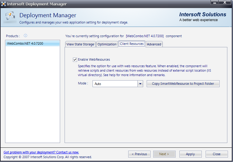 If you have applied SmartWebResources™ in your project, then this option will be automatically selected with its default mode set to Auto.