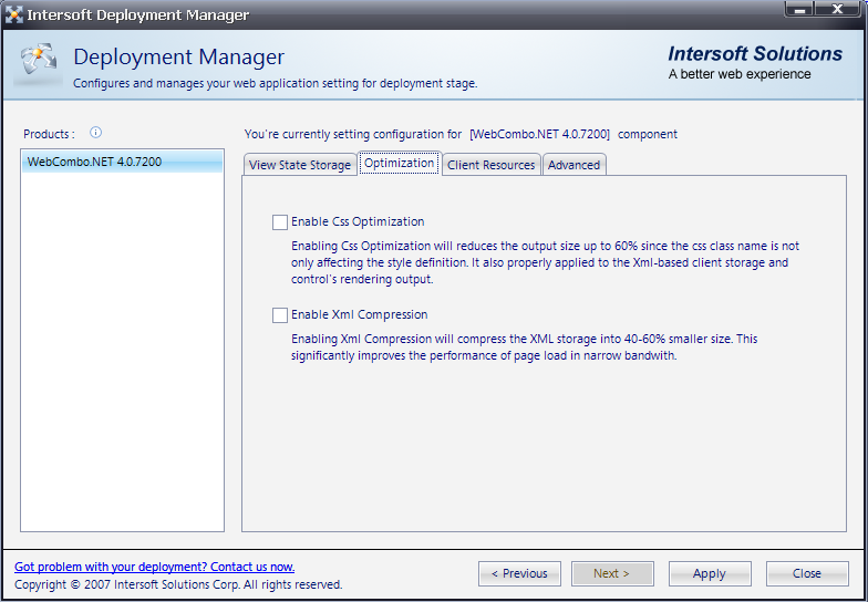- In this step, there are many settings you can configure such as View State Storage, Optimization, Client Resources and Advanced sections.