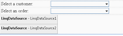 - Select the second WebCombo, set its DataSourceID to LinqDataSource2, DataTextField and DataValueField to OrderID.