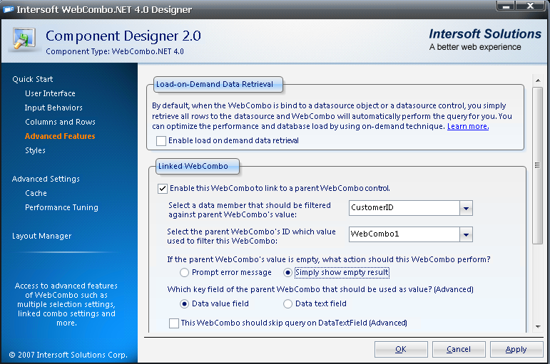 - Select the first WebCombo, set its DataSourceID to LinqDataSource1, DataTextField to ContactName and DataValueField to CustomerID.