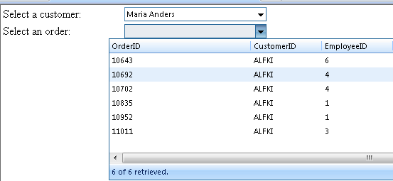 Try to interact with the WebCombo, such as selecting a customer. Next, when you open the Orders' WebCombo dropdown, you will see the order list of the selected customers.