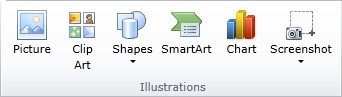 <Intersoft:UXRibbonTabGroup x:Name="tab2Group3" Header="Illustrations" Icon="/assets/icons/illustration.png"> <Intersoft:UXRibbonButton Content="Picture" MinimumSize="Large" LargeIcon="/assets/icons/picture.png" /> <Intersoft:UXRibbonButton Content="Clip Art" MinimumSize="Large" LargeIcon="/assets/icons/clipart.png" /> <Intersoft:UXRibbonDropDownButton Content="Shapes" MinimumSize="Large" LargeIcon="/assets/icons/shapes.png" /> <Intersoft:UXRibbonButton Content="SmartArt" Icon="/assets/icons/smartart.png" LargeIcon="/assets/icons/smartart.png" /> <Intersoft:UXRibbonButton Content="Chart" Icon="/assets/icons/chart.png" LargeIcon="/assets/icons/chart.png" /> <Intersoft:UXRibbonDropDownButton Content="Screenshot" Icon="/assets/icons/screenshot.png" LargeIcon="/assets/icons/screenshot.png" /> </Intersoft:UXRibbonTabGroup> |