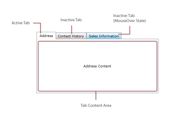 <Intersoft:UXTabControl Width="400" Height="200"> <Intersoft:UXTabItem Header="Address" HeaderDisplayMode="ContentAndImage" HeaderImage="/Assets/Address.png"> <Grid> <TextBlock Text="Address Content" VerticalAlignment="Center" HorizontalAlignment="Center"/> </Grid> </Intersoft:UXTabItem> <Intersoft:UXTabItem Header="Contact History" HeaderDisplayMode="ContentAndImage" HeaderImage="/Assets/History.png"> <Grid> <TextBlock Text="Contact History Content" VerticalAlignment="Center" HorizontalAlignment="Center"/> </Grid> </Intersoft:UXTabItem> <Intersoft:UXTabItem Header="Sales Information" HeaderDisplayMode="ContentAndImage" HeaderImage="/Assets/Sales.png"> <Grid> <TextBlock Text="Sales Information Content" VerticalAlignment="Center" HorizontalAlignment="Center"/> </Grid> </Intersoft:UXTabItem> </Intersoft:UXTabControl> |