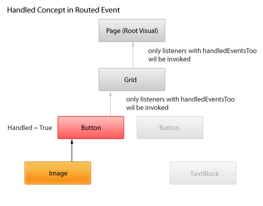 The following illustration shows how the value of Handled property affects a routed event process in the way such as described in the above list.