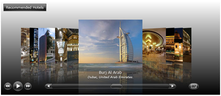 <Intersoft:UXFlow x:Name="UXFlow1" Width="700" Height="300" SlideShowButtonVisibility="Collapsed" FullScreenButtonVisibility="Collapsed"> <Intersoft:UXFlowItem ImageSource="le-meurice.jpg" Title="Hôtel Le Meurice" SubTitle="Paris, opposite Tuileries Garden."/> <Intersoft:UXFlowItem ImageSource="altira-macau.jpg" Title="Altira Macau" SubTitle="Taipa Island, Macau."/> ... </Intersoft:UXFlow> |