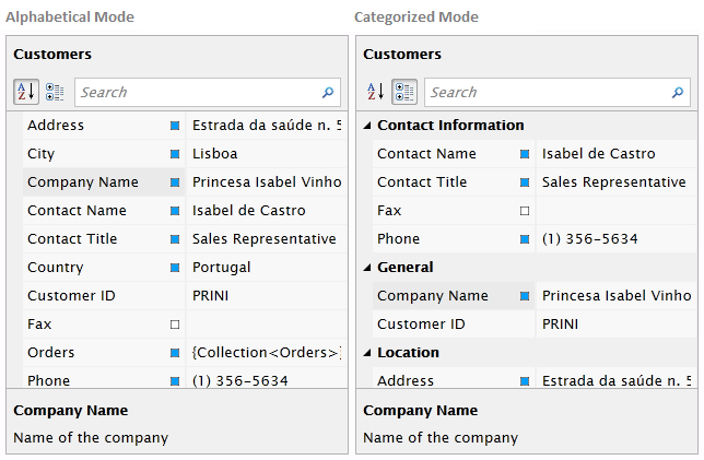 The following shows how properties is displayed in alphabetical and categorized mode.