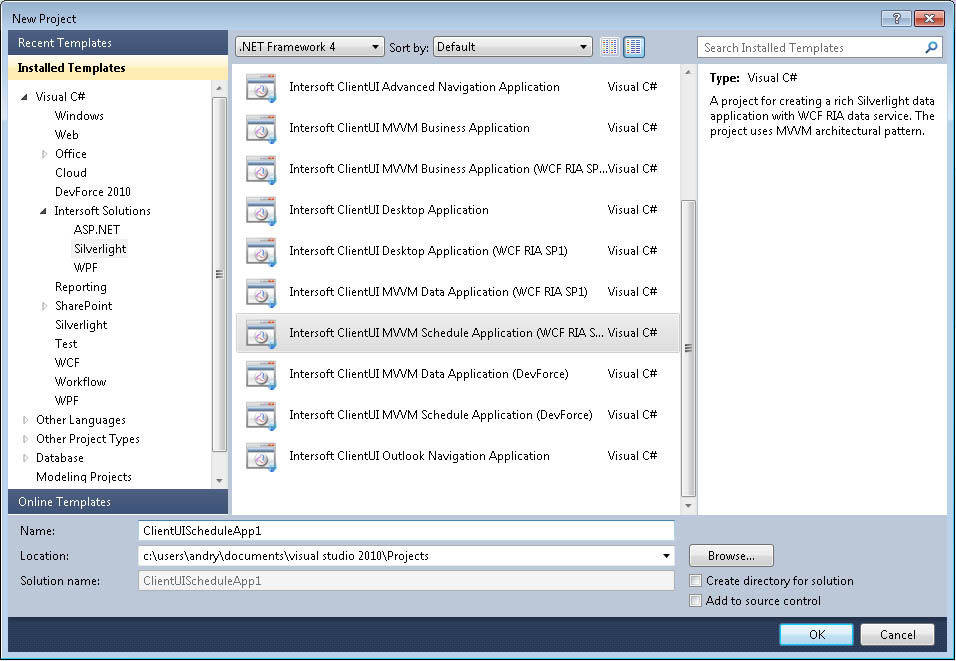 - In the list of templates, select Intersoft ClientUI MVVM Schedule Application (WCF RIA SP1). The following illustration shows an example of the Silverlight project templates.