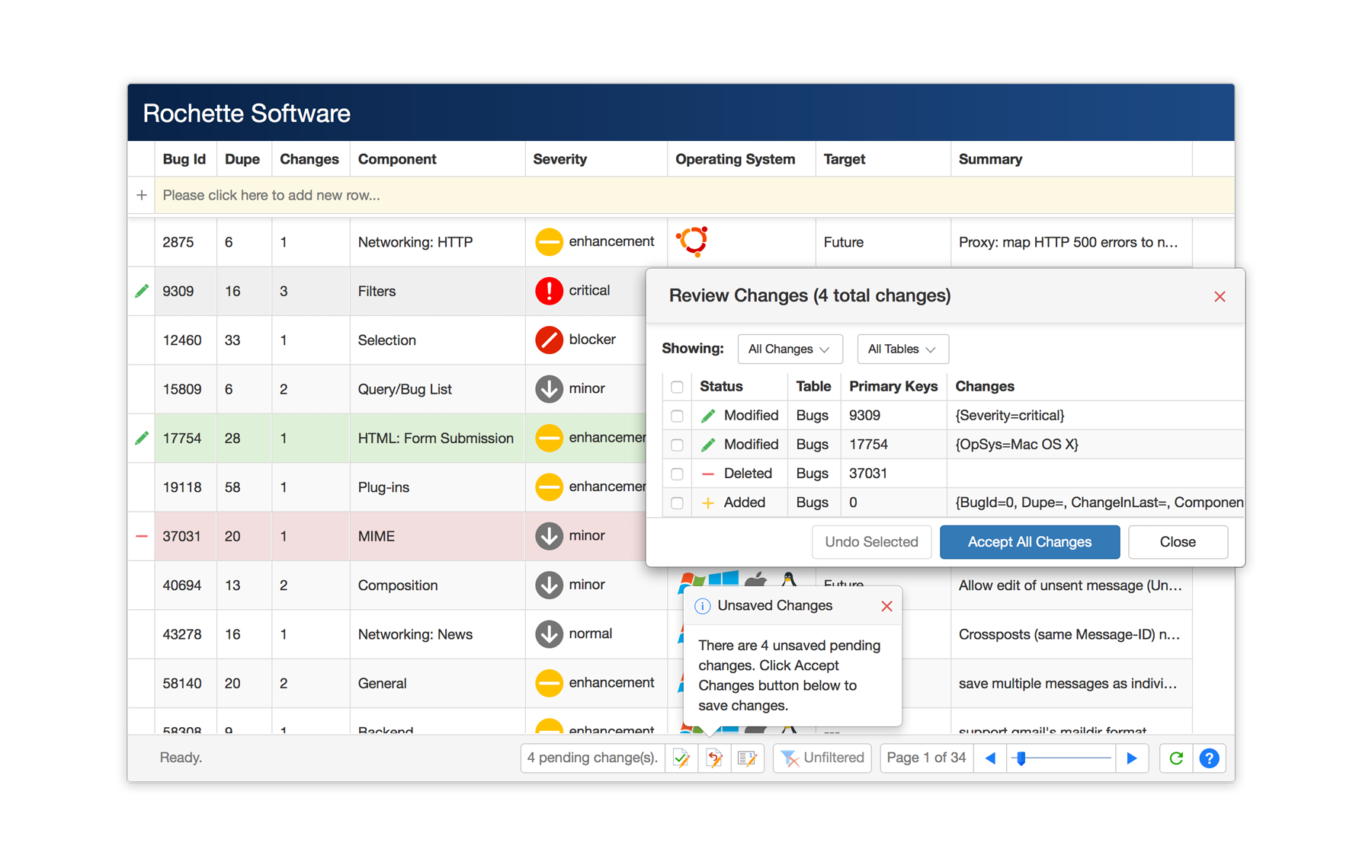 SmartBatchUpdate creates a revolution in data editing for modern enterprise applications. Unlike other data editing solutions, SmartBatchUpdate gives users control over updates to the physical database. This powerful and intuitive component also features a pending changes mechanism to notify user of changes made, cascading edit to perform editing in various table levels, automatic change preservation, and more. Learn more.